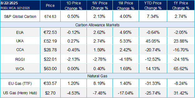 European carbon prices consolidated in the week ending August 22, with the Dec-25 futures contract posting a 2.6% weekly gain to end at €72.53. The front-December contract was supported by strengthening natural gas prices as the atmosphere in Ukraine worsened after President Trump appeared to take a back seat in the peace negotiations, while Russia and Ukraine continued to carry out attacks.