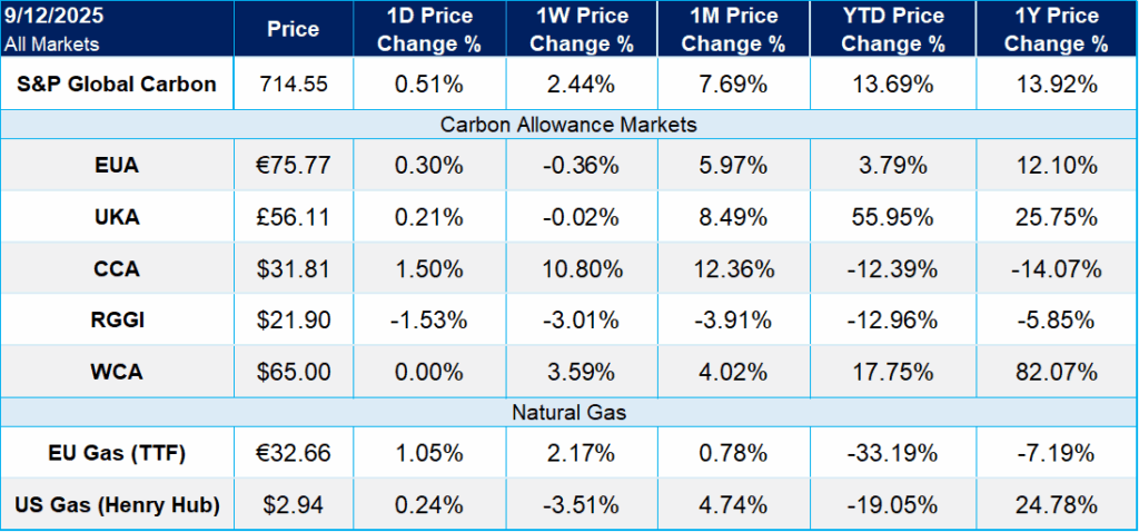 The weighted global price of carbon was $55.07, up 2.4% week-over-week. EUAs settled at €75.77, down 0.4% for the week. UKAs were flat at £56.11. CCA closed at $31.81, up 10.8% for the week. RGGI was down 3.0% a $21.90, while WCA was up 3.6% for the week at $65.00.