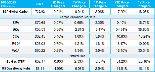 The weighted global price of carbon was $55.90, flat week over week. EUAs were up 0.7% for the week, closing at €79.68. UKAs trended down 2.6% to end at £55.53. CCAs saw a 1.0% gain over the week, settling at $32.45. RGGI was up 4.2% at $23.03 and WCAs were up 1.3% at $65.22.