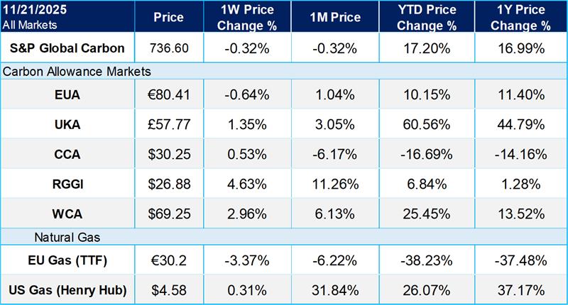 The weighted global price of carbon was $55.70, down 0.3% week over week. EUAs were down 0.6% over the week at €80.41. UKAs were up 1.4%, to close at £57.77. CCAs were up 0.5% at $30.25. RGGI was up 4.6% at $26.88. WCAs were up 3.0% at $69.25.