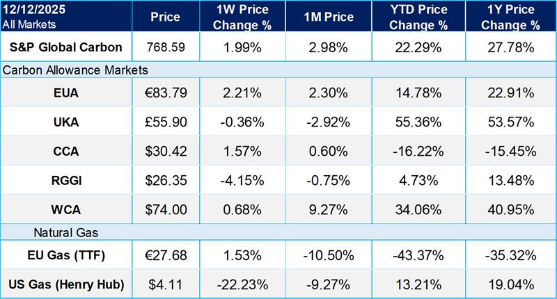 EUA prices rose 2.2% last week, closing at €83.79 on December 12, having posted a high for the week of €84.40, just 10 cents shy of the year-to-date (YTD) high of €84.50. The December options expiry was uneventful, and with the Dec-25 contract expiring today, the Dec-26 contract becomes the benchmark contract. Dec-26 EUAs settled at €86.04 on December 12, again close to the YTD high of €86.99, and €90 now seems within reach over the next couple of weeks, given the holiday auction drought.