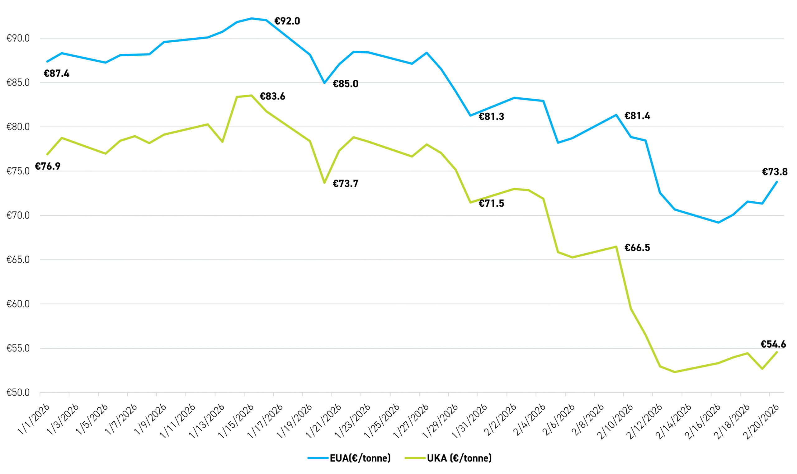 Figure 1: EUA/UKA* closing prices (Dec-26 contract), January 1 - February 20, 2026 (€/tonne)