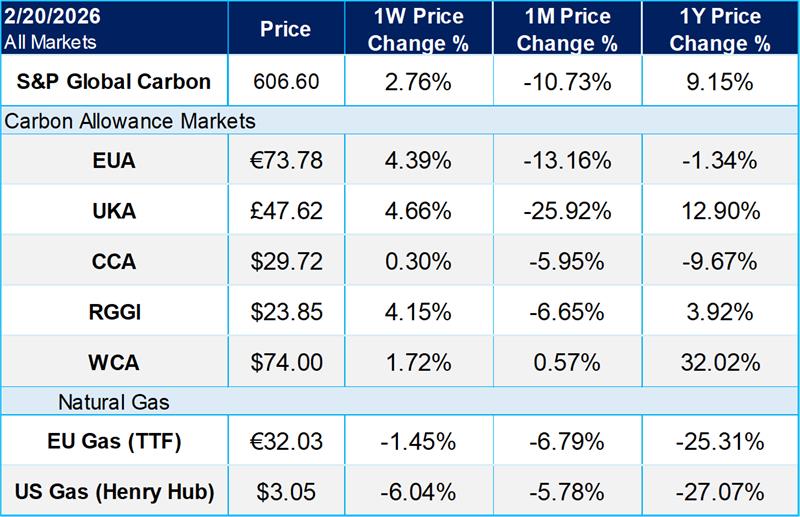 The weighted global price of carbon recovered over the week to close at $52.44, up 2.76% week over week. EUAs rose to €73.78, gaining 4.39% on the week, while UKAs closed at £47.62, up 4.66%. In North America, CCA prices edged up to $29.72, a 0.30% weekly increase, with RGGI allowances advancing to $23.85, up 4.15%. WCA also moved higher, ending at $74.00, a 1.72% gain over the period.