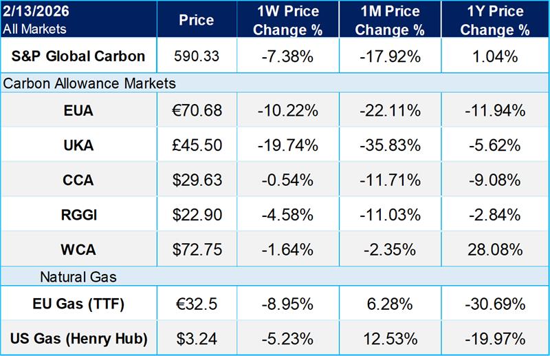 While the legal battles begin on the implications of the EPA’s decision, US markets continued to trade as normal, albeit with a softer tone. CCAs were down 16 cents on the week at $29.63/t as the market prepares for the Q1 auction (February 18). The February 2026 auction will offer 55 million V26 allowances, alongside an additional 7.2m V25 allowances from the under-subscribed May 2025 auction. With current spot prices barely above the 2026 floor of $27.94/t, there is some speculation that this auction too might be under-subscribed, but we expect compliance players to support the auction given the current low prices near the floor and the expectations of a tighter market going forward in line with the recently published ISOR.